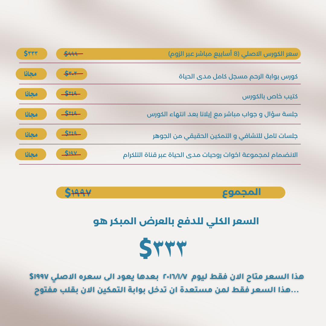 إذا كنت مهتمة بكورس البوابات الثلاثة المباشر live عبر الزوم لمدة ستة أيام من ال